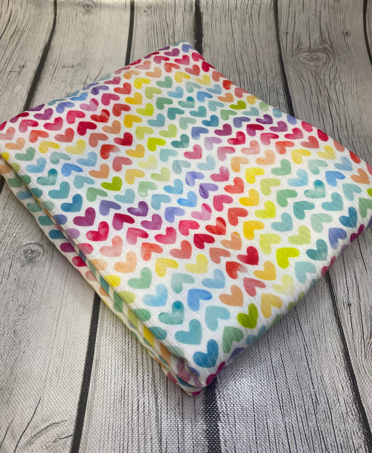 Ready to Ship Rib Knit Watercolor Rainbow Hearts Valentine makes great bows, head wraps, bummies, and more.