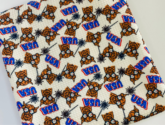 Ready to Ship Bullet fabric Fourth of July Highland Cow Animals makes great bows, head wraps, bummies, and more.